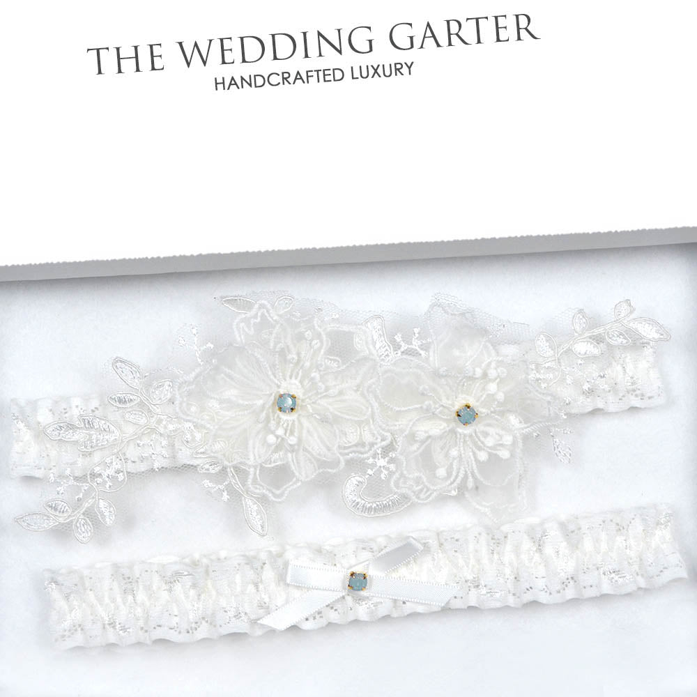 Our new season ivory lace wedding garter set for the modern bride to be is embellished with organza flowers, lace applique and cloudy opal charms. Made in pale ivory lace & soft lace band with elastic backing, this designer creation is a perfect match with any floral wedding dress. Adorned with a floral appliqué and opal crystal embellishments.